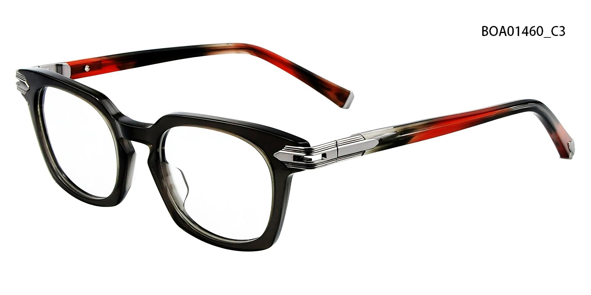 This square frame features high-end acetate with subtle transparency, creating a layered effect. The metal accents at the hinges add a futuristic edge, while the overall silhouette maintains a sense of balance between strength and refinement.